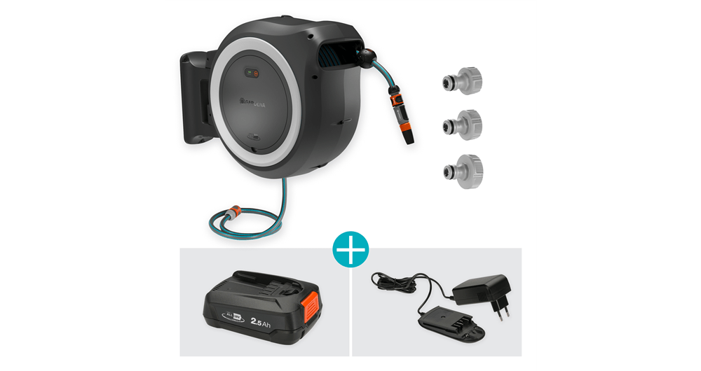 - Set: Set mit 40 m GARDENA Qualitätsschlauch 13mm (1/2"), Anschlussschlauch, Original GARDENA Systemteile und Reinigungsspritze, Wandhalterung mit Schrauben, Dübeln und Montagehilfe, 2.5Ah P4A Akku, Ladegerät