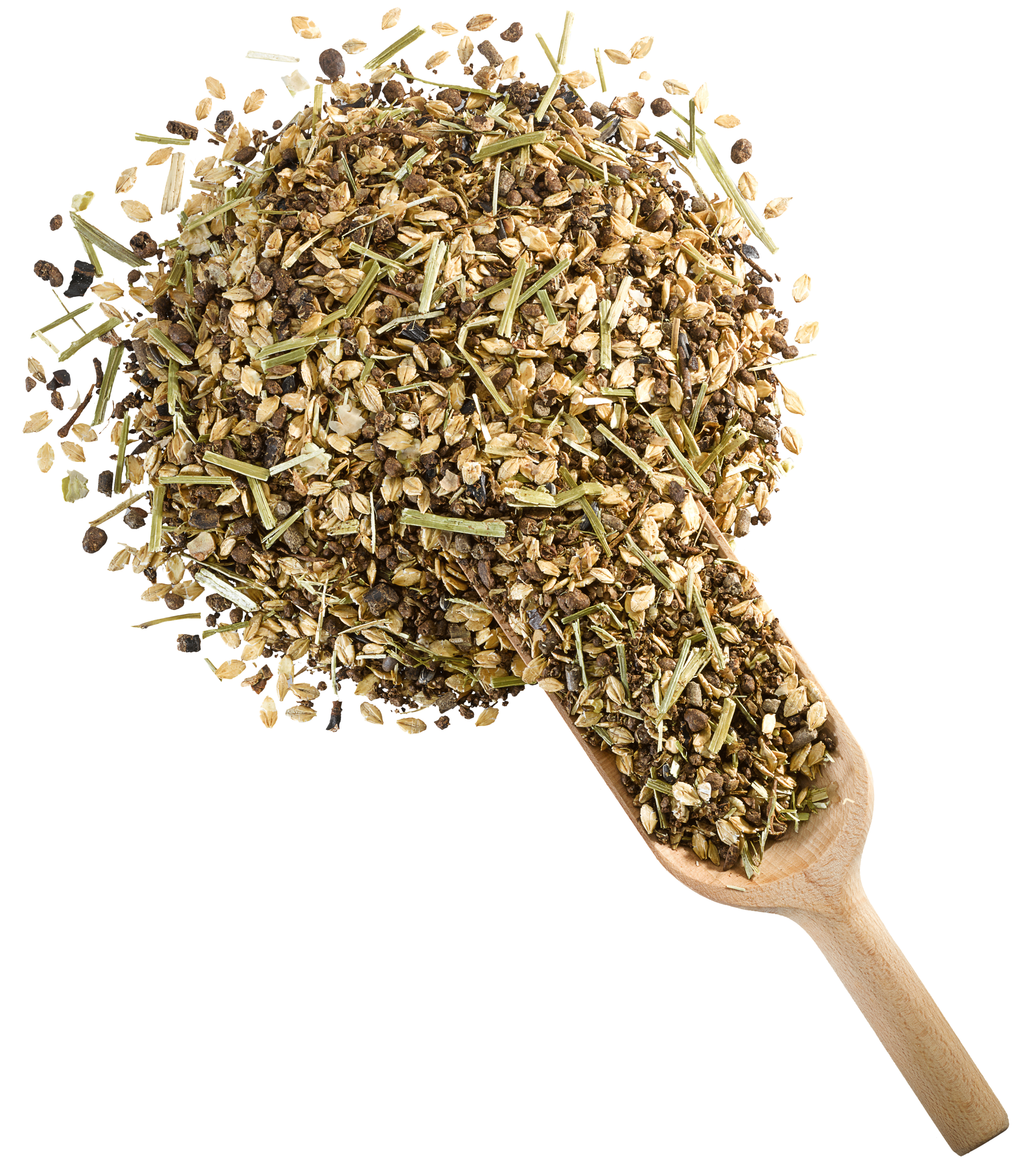 46 % Apfeltrester, 35 % Gerstenflocken, Johannisbrotmehl, 3 % Luzerneheu, Leinextraktionsschrot, Erbsenflocken, 2 % Sonnenblumenkerne, Calciumcarbonat, Leinöl, Natriumchlorid, Monocalciumphosphat