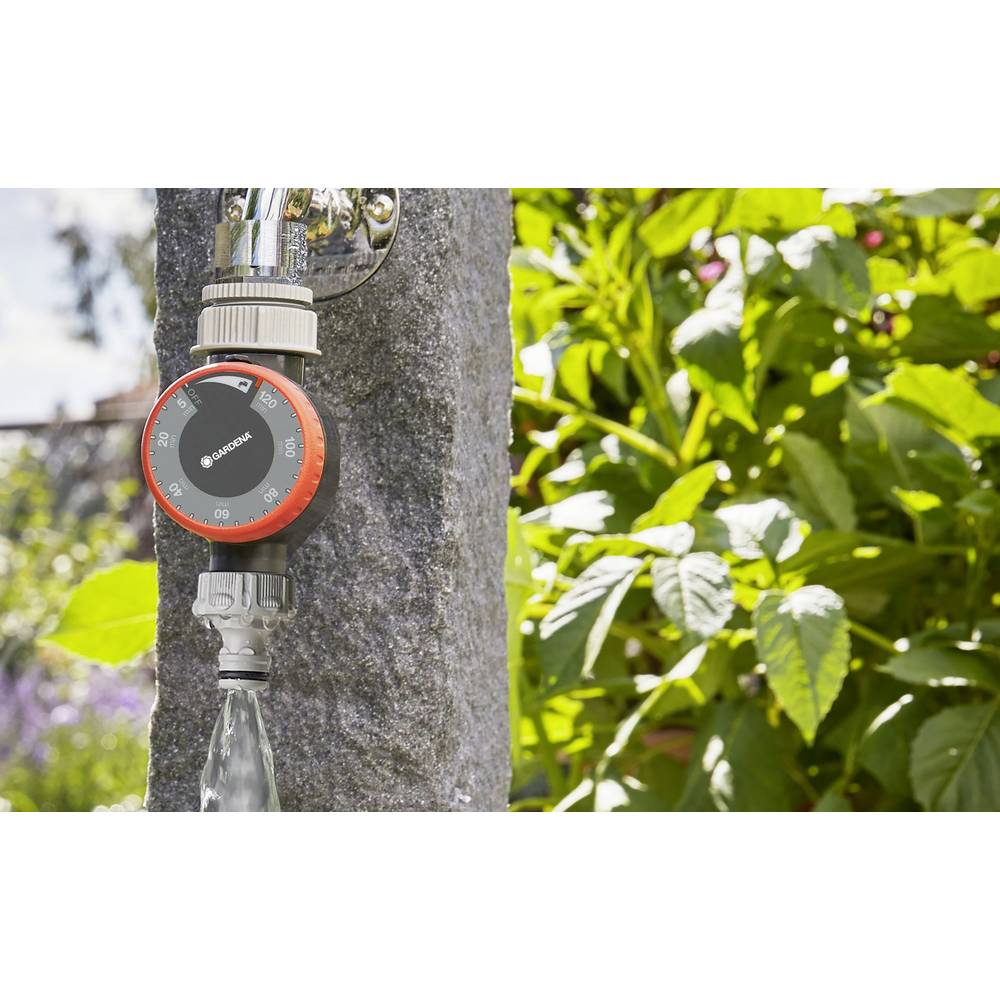 Die GARDENA Bewässerungsuhr schaltet die Bewässerung im Garten automatisch ab. Das Gerät wird einfach an den Wasserhahn angeschlossen und lässt sich leicht über das große Drehelement bedienen. Der Betrieb eines Regners oder einer Tropfbewässerung kann manuell gestartet werden. Die Bewässerungsdauer, zwischen 5 und 120 Minuten, wird an der Bewässerungsuhr eingestellt. Nach Ablauf der voreingestellten Zeit stoppt der Wasserfluss automatisch. Eine Batterie ist für den Betrieb nicht notwendig.