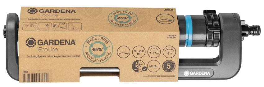 Der EcoLine Viereckregner von GARDENA bewässert rechteckige Rasen- oder Beetflächen zwischen 90 und 220 m² gleichmäßig und präzise – ganz ohne Pfützenbildung. Er wurde mit Kunststoff aus mehr als 65 Prozent recyceltem Material aus üblichen Haushaltsabfällen stammend, entwickelt und ist damit die nachhaltige Lösung für das Besprinkeln Deines Rasens an heißen Sommertagen. Die Rohre der Regners sind aus Aluminium gefertigt, welches aus mehr als 25 Prozent recyceltem Material besteht. Die verarbeiteten Metallelemente verstärken die Robustheit und Langlebigkeit des Regners und sehen dazu noch schick aus. Stelle Deinen Regner mit einem Schlauch an den Wasserhahn verbunden einfach auf Deinen Rasen und schalte das Wasser an. Per Regler kannst Du dann ganz einfach die Wurfweite des Regners stufenlos zwischen 7 und 17 Metern einstellen. In der Breite erreicht der EcoLine Viereckregner maximal 13 Meter. Egal, ob Du ein kleines Beet oder Deine ganze Rasenfläche wässern möchtest – der Viereckregner ermöglicht Dir beides. Der Regner ist UV- und frostgeschützt, sodass Du ihn das ganze Jahr draußen stehen lassen kannst. Ein weiteres Highlight, das die Langlebigkeit des Produkts unterstützt, sind die cleveren und schnellen Reinigungs-Tools des Regners: Ein eingebauter, entnehmbarer Filter verhindert, dass Schmutzpartikel in das Innere des Regners gelangen. Du kannst ihn selbst herausnehmen und einfach unter dem Wasserhahn von Schmutz befreien. Falls sich an den Düsen Kalk anlagern sollte, nutzt Du die enthaltene Nadel. Damit stichst Du verstopfte Düsen ganz schnell wieder frei. Der EcoLine Viereckregner ist Made in Germany und wird von GARDENA mit einer Herstellergarantie von fünf Jahren unterstützt. Die natürliche Wahl für leidenschaftliche Gärtner. ReTh!nk – die neue EcoLine Reihe. Nachhaltig entwickelt. Ansprechend designt. Robust gebaut.