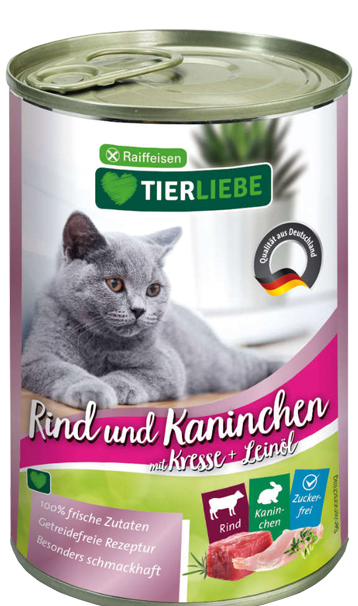 TIERLIEBE Rind und Kaninchen mit Kresse + Leinöl ist eine leckere Katzenvollnahrung für alle ausgewachsenen Katzen ab dem 2. Lebensjahr.