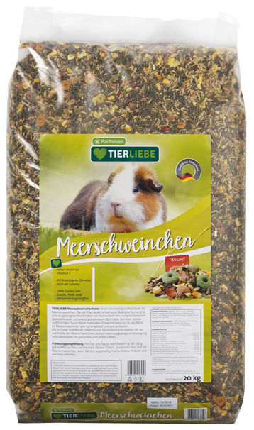 TIERLIEBE Meerschweinchenfutter ist ein hochwertiges Mischfutter für Meerschweinchen. Die von Fachleuten entwickelte Qualitätsmischung ist eine ausgewogene Kombination von Getreidekörnern, aufgeschlossenen Getreideflocken, schonend getrocknetem Grünfutter, Gemüse, Saaten und Früchten. Durch diese besondere Zusammenstellung ist das Menü für Meerschweinchen sehr schmackhaft und gut verdaulich.