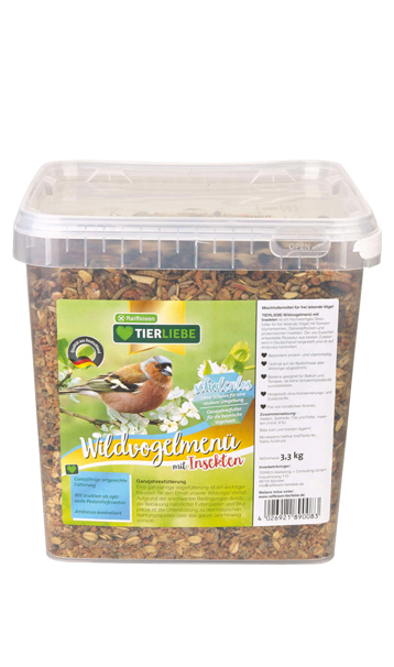 TIERLIEBE Wildvogelmenü mit Insekten ist ein hochwertiges Streufutter für frei lebende Vögel mit Sonnenblumenkernen, Getreideflocken und proteinreichen Insekten. Die von Experten entwickelte Rezeptur aus besten Zutaten wird in Deutschland hergestellt und ist auf Ambrosia kontrolliert.