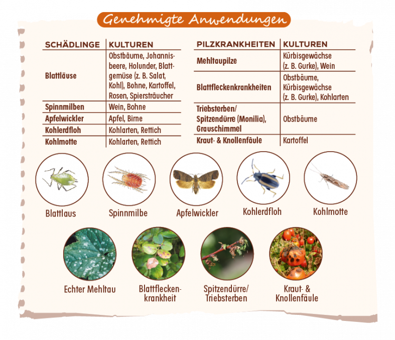 - Als Fungizid gegen Blattfleckenkrankheit, Grauschimmel, Triebsterben, Mehltaupilze und Kraut- und Braunfäule